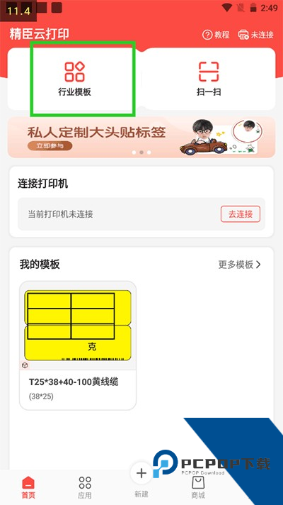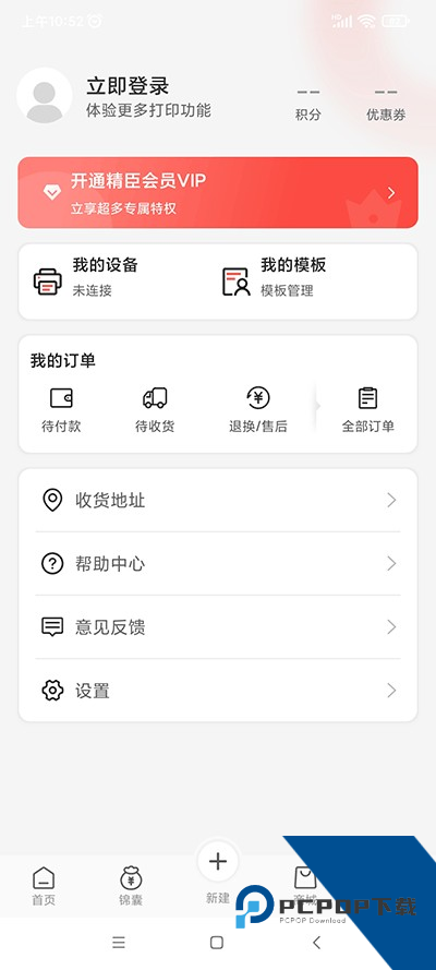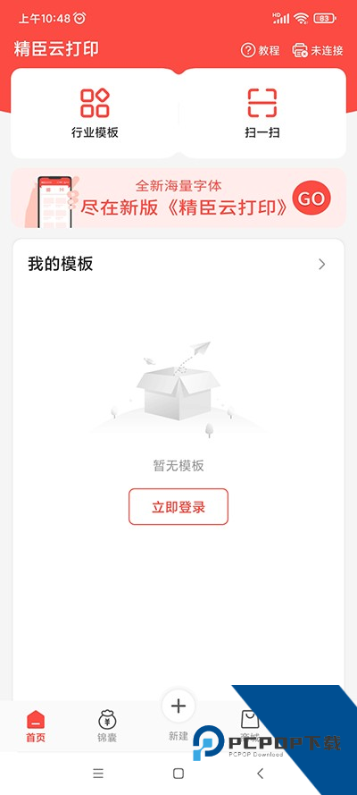 1、在本站下载安装精臣云打印手机版,运行软件,有首页、锦囊、新建、商城、我的五个板块;