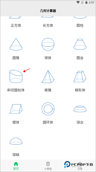 1、打开几何计算器app后会看到很多的几何模型,以斜切圆柱体为例,点击它。