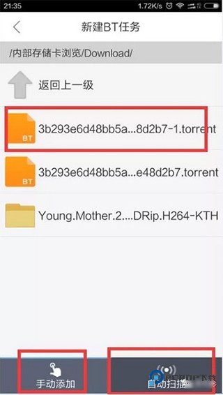 2、新建BT任务,并选择BT,将添加到任务中。你可以手动添加BT,也可以自动扫描手机中的BT。(备注:已经在网站上下载好的,默认的手机保存位置,在手机中的Download文件夹中)