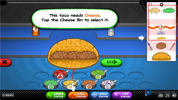 11、玩家只需左右滑动,即可撒上配菜,最后,所以配菜上完后,点击绿色方向键;