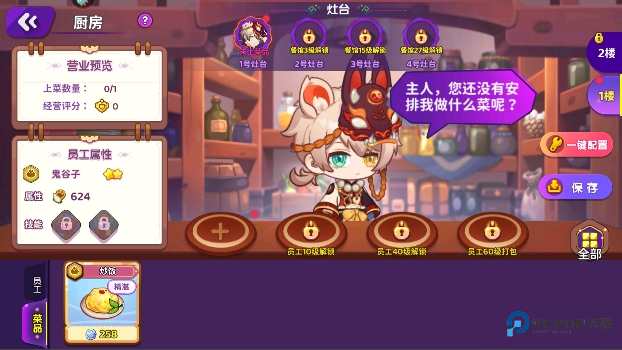 1、餐馆的核心区域,可以上阵指定厨师和菜品。