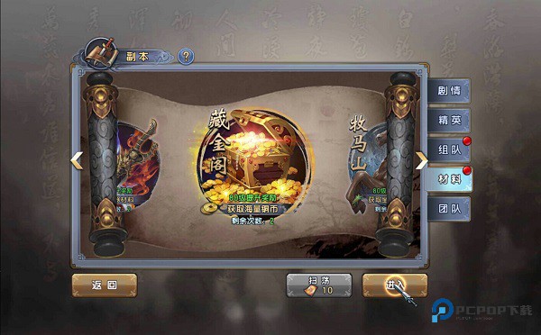 铜币副本,又叫“藏金阁”副本,是游戏中获得铜币的主要来源之一,重要性毋容置疑。每位玩家每天可进入2次,是的你没看错,只有2次,就算你是VIP玩家都不能多进1次!这样也从根本上拉近了平民玩家和土豪们的差距,真的国产良心啊!