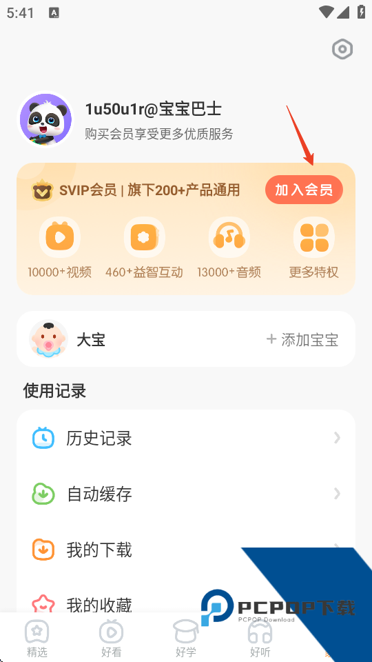 1、打开宝宝巴士app,点击右下角【家长】-【加入会员】