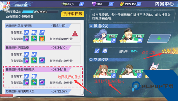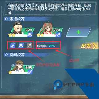 3、每个任务都有成功率,越高级的任务对校花的要求越高。影响成功率的因素有:校花等级、星级、战斗力以及任务所需的校花类型搭配。