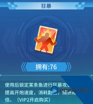 2、狂暴:使用该道具,也是会在一定时间内自动锁定打渔场中倍数较高的鱼,但是狂暴的射速是比锁定快的,并且消耗的金币也是比平常多的,相对的捕获鱼的概率也会比锁定的高,因为狂暴道具是自带锁定的,所以建议道具较少的船长可以选择其中一个道具使用,尽量不要选择在狂暴或者锁定的时间还没有结束的时候就立刻使用另外的道具,从而节省道具。