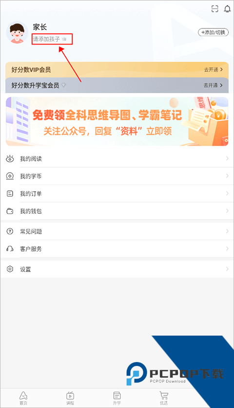 1、首先在好分数学生版我的页面点击头像下方的“请添加孩子”