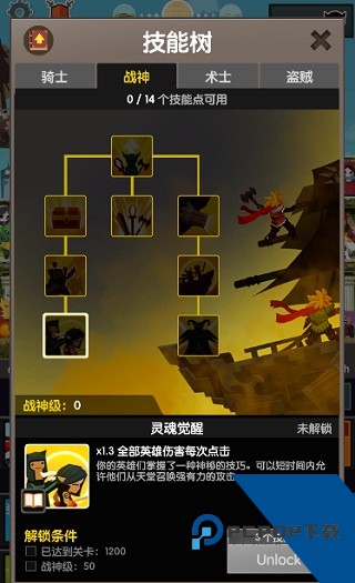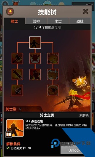 1、首先,技能树分为四种天赋——骑士、战神、术士、盗贼,其中的骑士这一加点主要是活跃点击使用的,如果你经常在线,那你非常适合这个天赋;