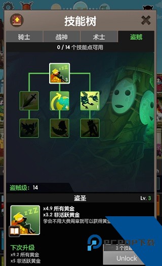 4、至于盗贼加点也是我最热衷的加点,毕竟我懒嘛!一技能加黄金,二技能加上无声行军后妥妥的变成放置游戏;