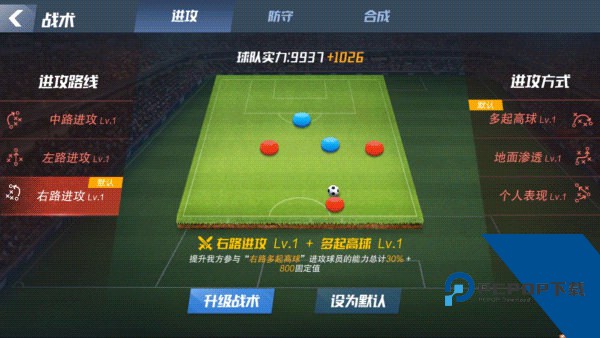 1、10级前提升战力主要为:获取球员升等级,升战术,升阵型。
