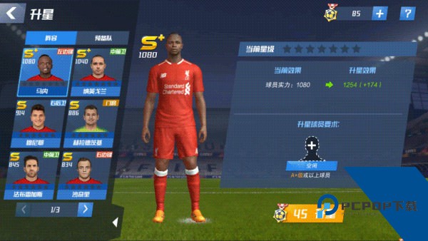 9、玩到11级左右(忘了11还是12了),升星功能开启,升星主要是吃球员+升星材料,球员要求倒不高,s+只要a+的就行了。吐槽下,升星功能开启竟然也没有引导,我还找了一段时间才找到哪里进去,必须吐槽。不过升星加成还是挺可观的,s+升一星瞬间加200的能力,开心!