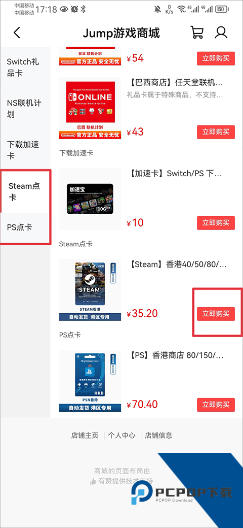 2、进入后,在左边分类中选择steam点卡或者ps点卡,然后点击立即购买