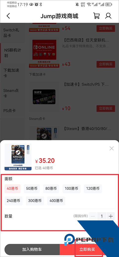 3、最后选择购买面额和数量后,点击立即购买并支付订单后即购买成功