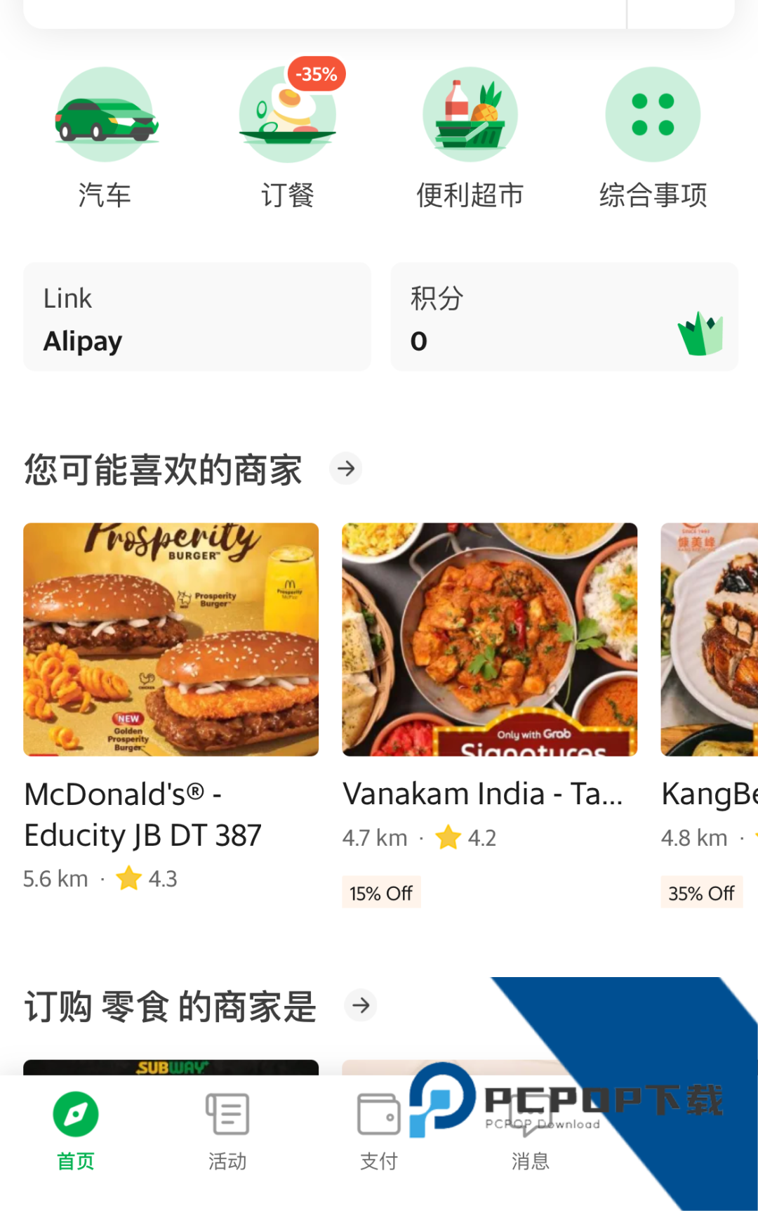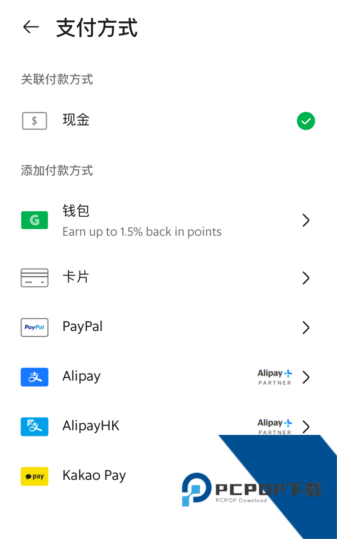 支付方式可选择现金、Grabpay、Alipay(支付宝)、银行卡支付。