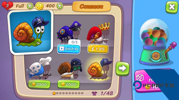 4、为了缓解玩家们的视觉疲劳,蜗牛鲍勃3提供了各种服饰,通过闯关累积金币数量,并通过开启扭蛋机获得。