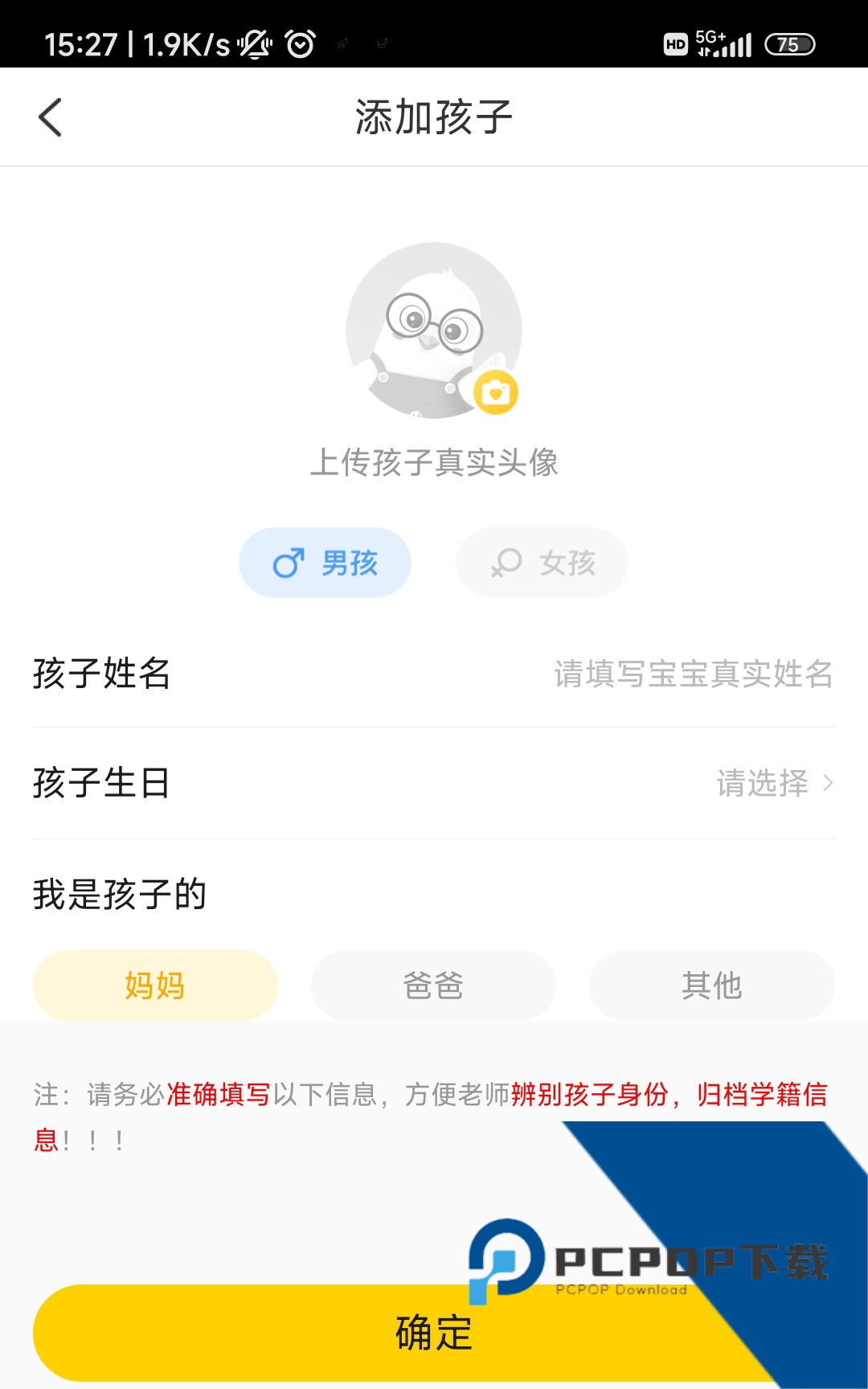 2、输入孩子的姓名,生日,还有自己与孩子的关系,然后点击【确定】