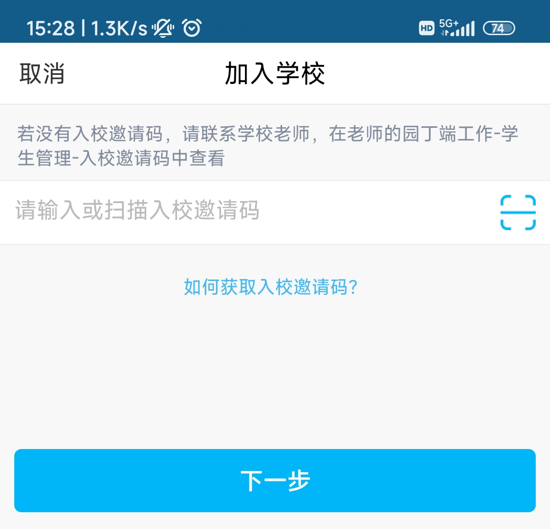 4、输入或扫描入校邀请码,点击【下一步】,进入加入学校界面后,选择年级、班级等信息,点击【确认加入】选项即可