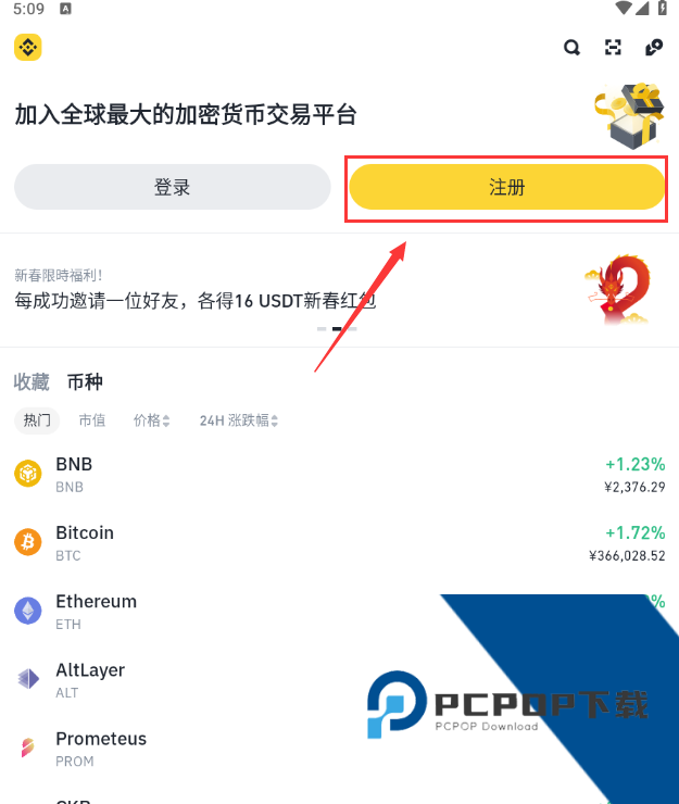 1.打开币安App,点击【注册】。