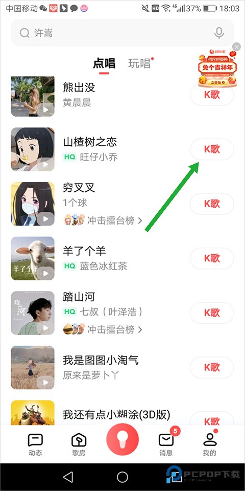 1、用户进入点歌页面中选择自己想要合唱的歌曲,点击旁边的【K歌】