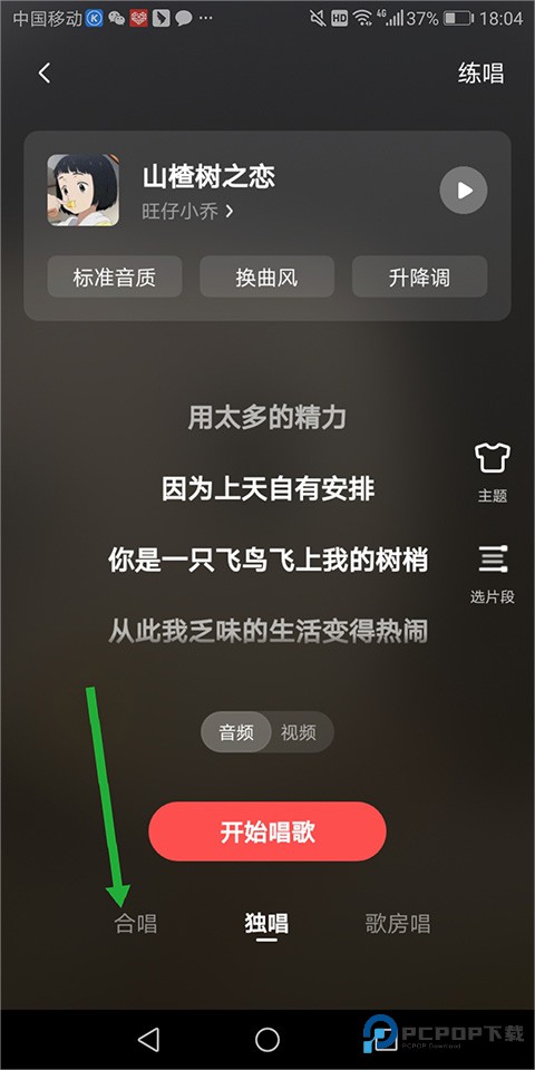 2、在打开的新页面中点击底部的【合唱】(下图绿色箭头所指区域)