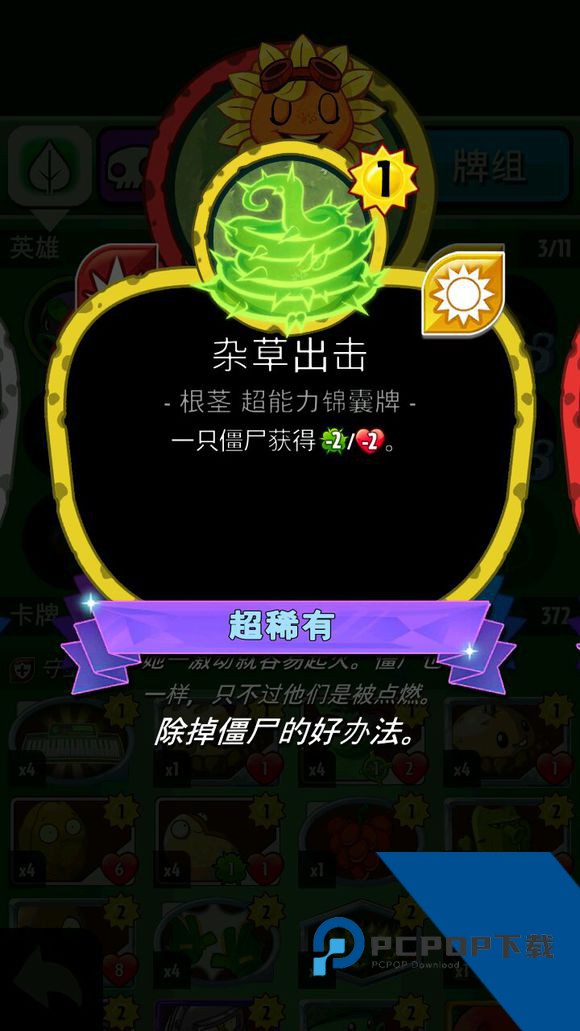 b、杂草出击:一只僵尸获-2/2这张牌多用来削弱大哥,或者消灭一些高威胁的单位(水兵嘿嘿一笑,然后就没有然后了)。