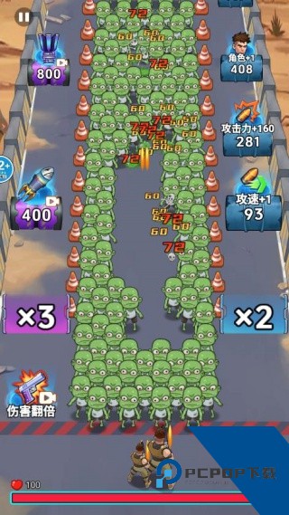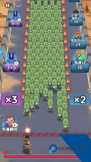 2、接着就会有大量的僵尸不断向你靠近,玩家就需要移动角色不断的左右来回射击;