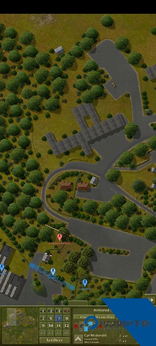 如图所示,我方的后续部队被敌方察觉,但由于丛林的复杂环境,敌人未能成功对我方进行交叉火力压制。在这种情况下,决定让部队继续推进,并派遣M5A1坦克进行支援。地图最左端的机械步兵则展开穿插战术,利用周围遮蔽物的掩护,避免遭受敌方火力打击。