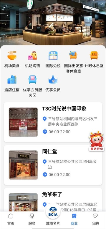 3、另外,如果用户想要在机场购物消费,点击进入“商业”界面,查询美食商店、超市等位置,享受机场提供的商业服务