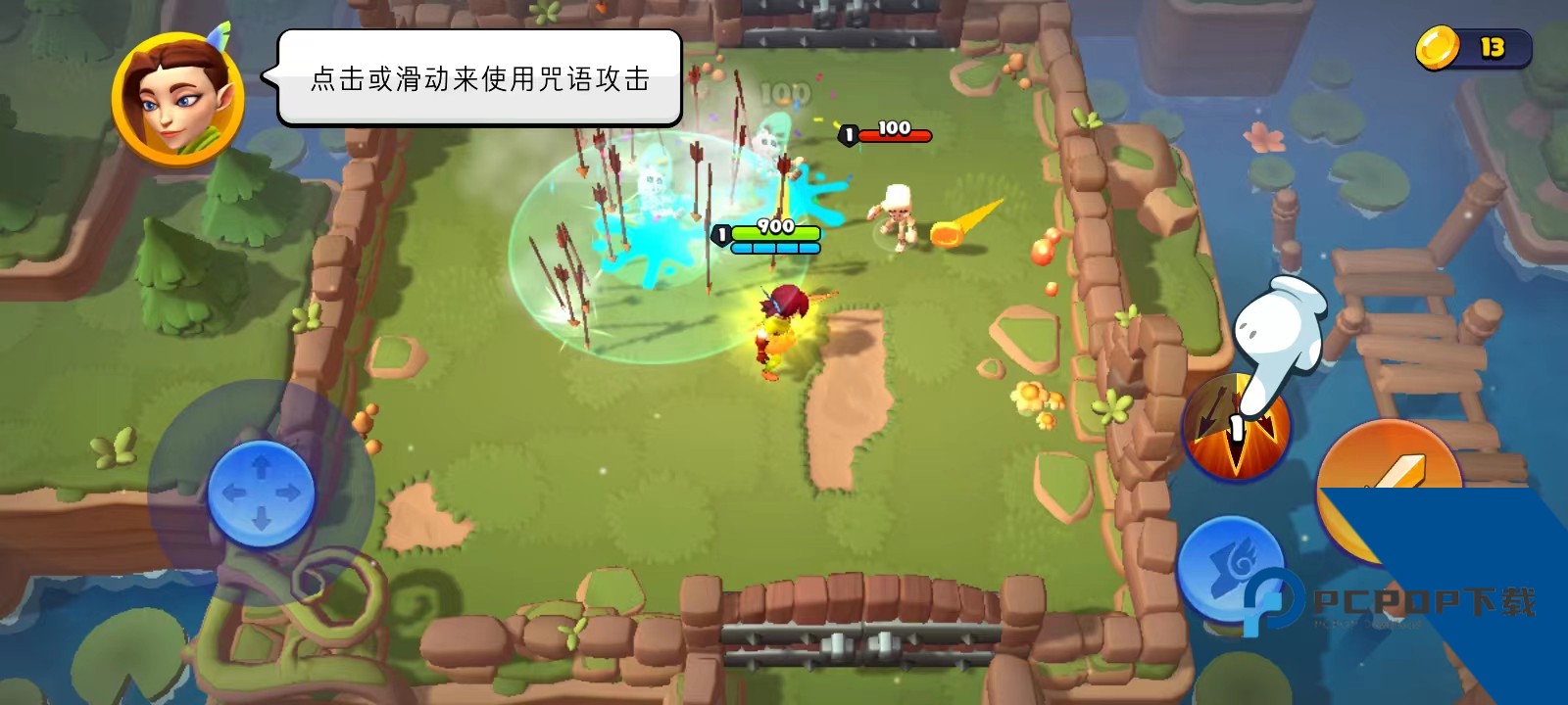 2、左边的按钮控制角色的移动,而右边的按键则是冲刺、攻击,冲刺按钮可以避免任何伤害,而攻击按钮分为武器攻击和咒语攻击;