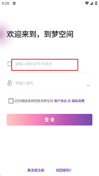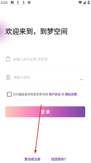 1、打开到梦空间的登录页面,点击下方的激活或注册选项,进入激活/注册账号页面。