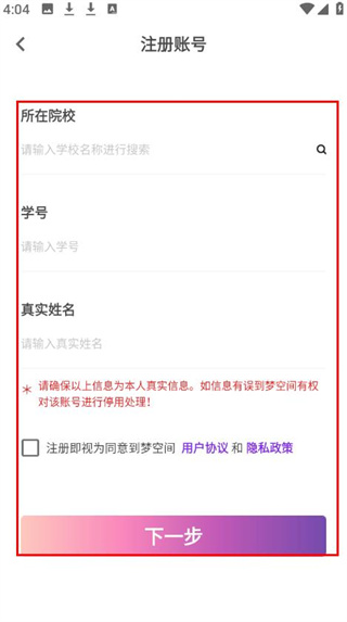 3、在注册账号页面,填写所在院校、学号、真实姓名,勾选同意用户协议和隐私政策后,点击下一步完成后续注册流程。