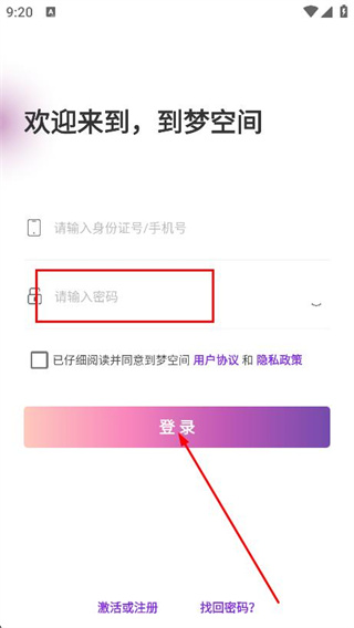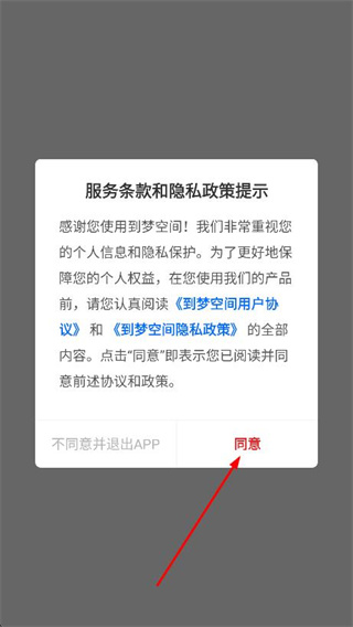 1、打开到梦空间app,在隐私政策弹窗中,点击同意。