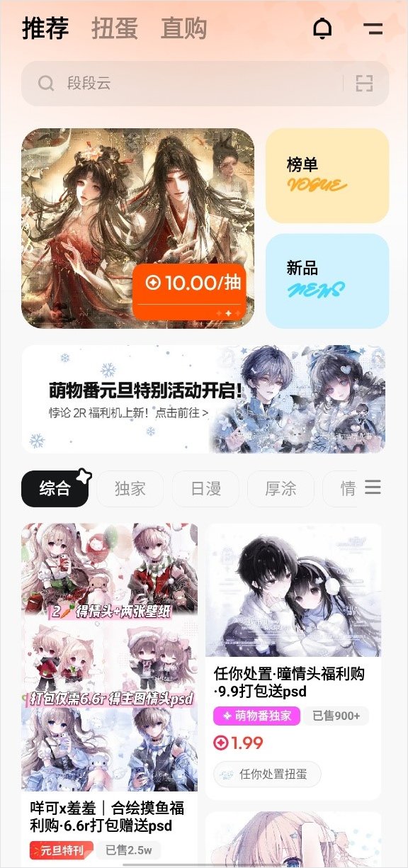 萌物番App除了提供扭蛋等抽取的购买方式,还支持直购。用户对一些心仪的头像、壁纸等产品可以直接购买,不用充钱靠概率的方式抽取。平台上还有众多的画师入驻,他们可以源源不断为用户提供多种类型的头像、壁纸等内容。