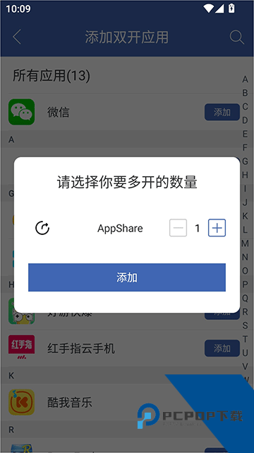 2、然后选择想要添加的双开应用,再选择多开的数量,点击“添加”