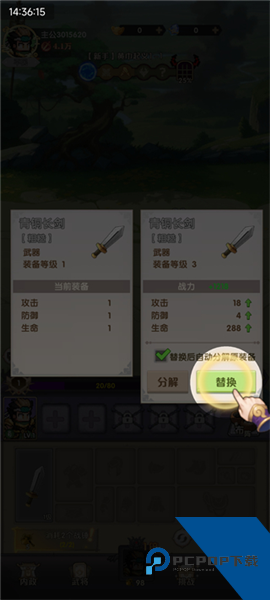 当获得新装备时,系统会弹出装备对比界面。玩家可以轻松将旧装备(如1级粗糙青铜长剑)替换为更高等级(如3级)的同品质装备,显著提升武将的攻击、防御和生命值属性。同时,替换后的原装备将自动分解,为玩家提供更多资源。