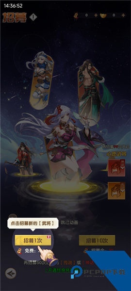 进入招募界面,玩家可以免费进行招募,每次招募都能获得新的武将。通过累计招募次数,玩家将解锁心愿武将,获得传说和神话品质的强力角色,为后续的战斗做好准备。