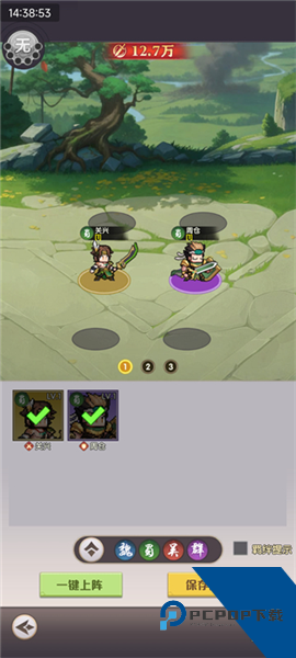 玩家可以自由拖动关兴、周仓等武将上阵,根据战术需求进行阵容搭配。也可使用“一键上阵”功能,快速配队并保存阵容。设置好的阵容将用于后续主线战斗。