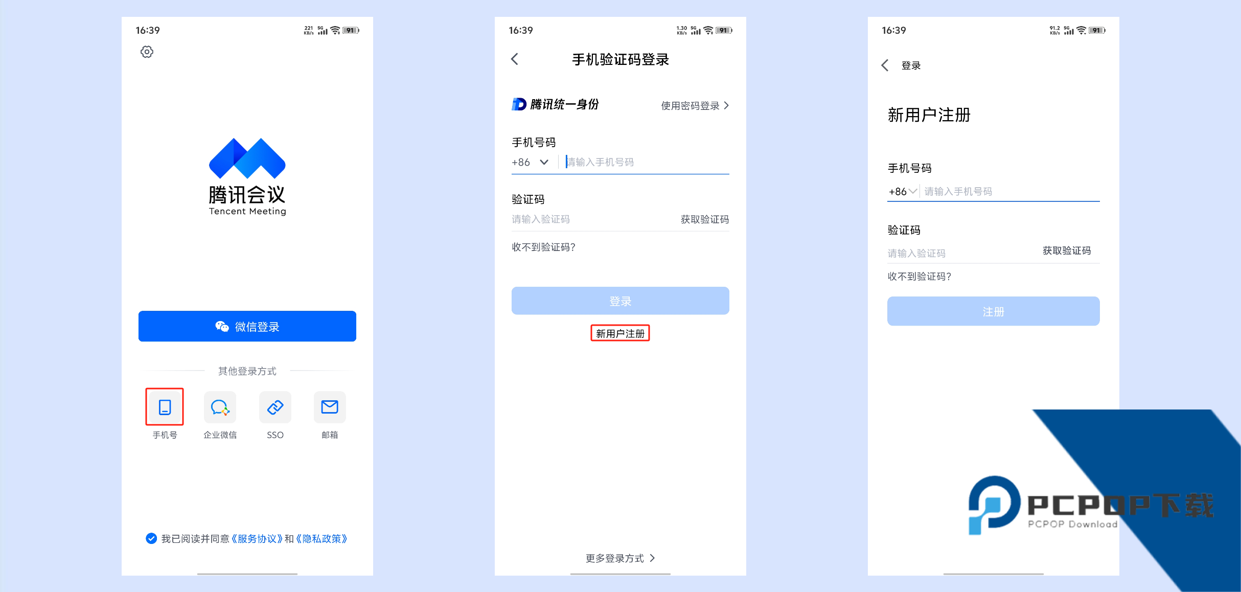 打开腾讯会议,点击手机号登录按钮,进入帐号密码登录页面,点击新用户注册进入注册页,根据要求填写对应的信息并完成注册。