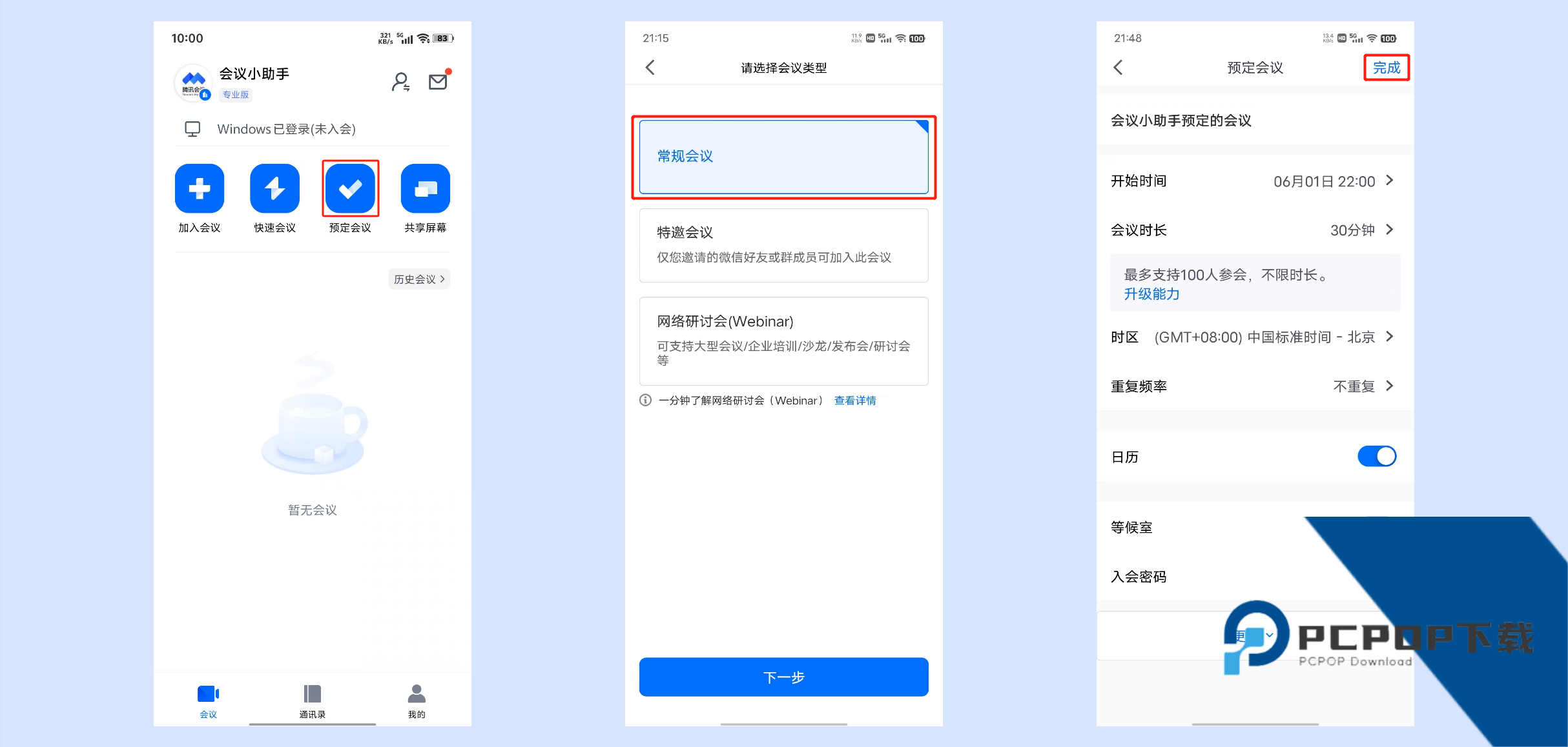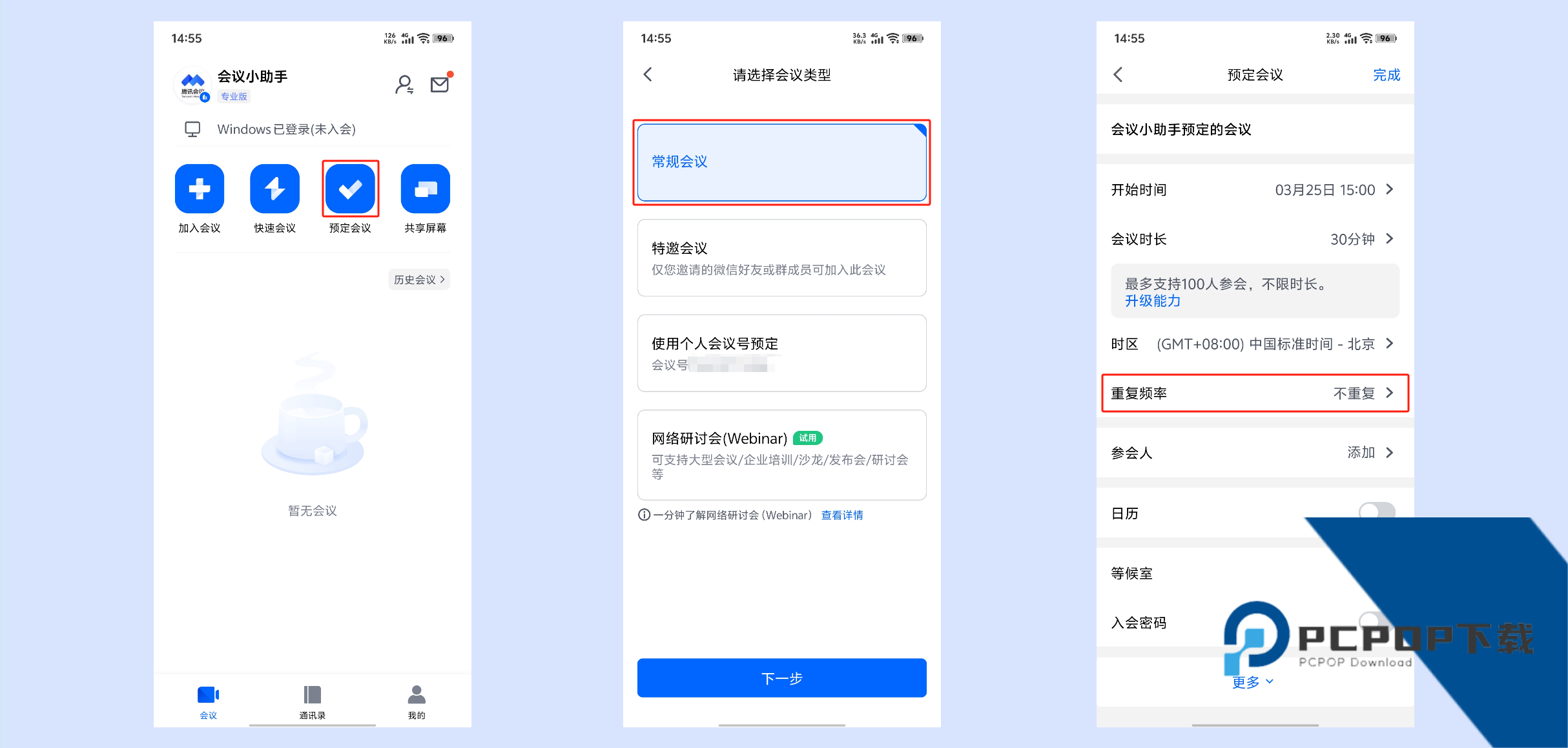 除了预定普通的会议,您还可以通过腾讯会议预定周期性会议——即在您设定好会议频率和会议次数(或是时间段)后,自动帮助您预约会议。