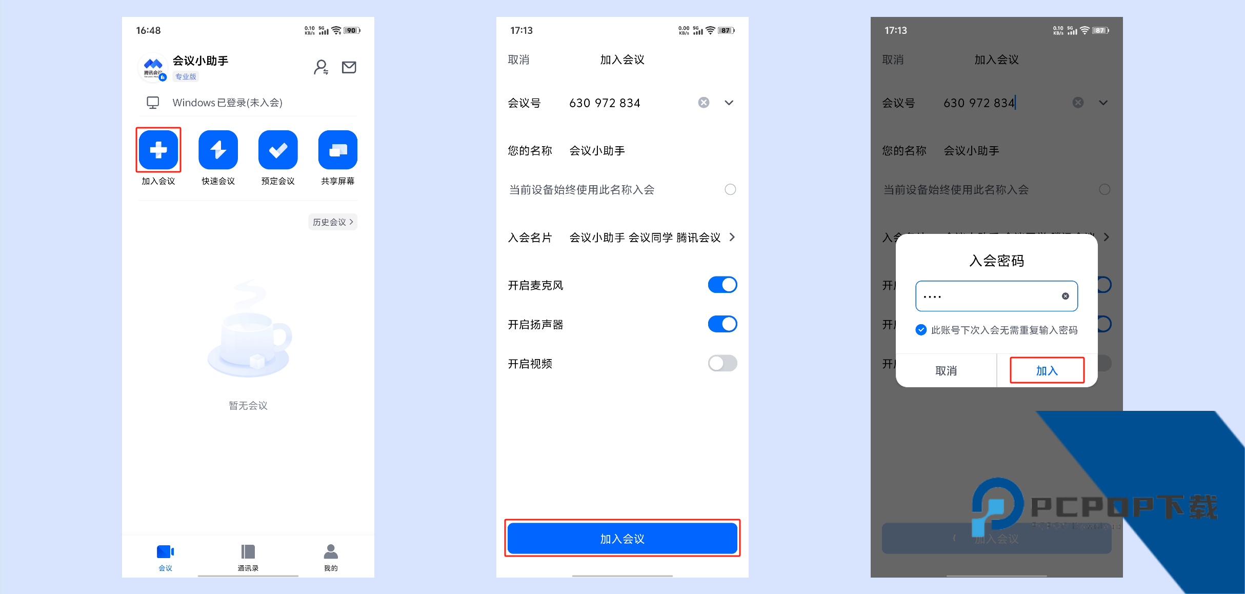打开腾讯会议,在腾讯会议主面板,选择”加入会议“,输入会议号,以及您希望在会议中显示的名字(默认使用您个人资料页的昵称),并勾选相应的入会前设置项,点击”加入会议“即可成功入会;若设置了入会密码,则需输入正确的密码,再点击“加入”即可成功入会。