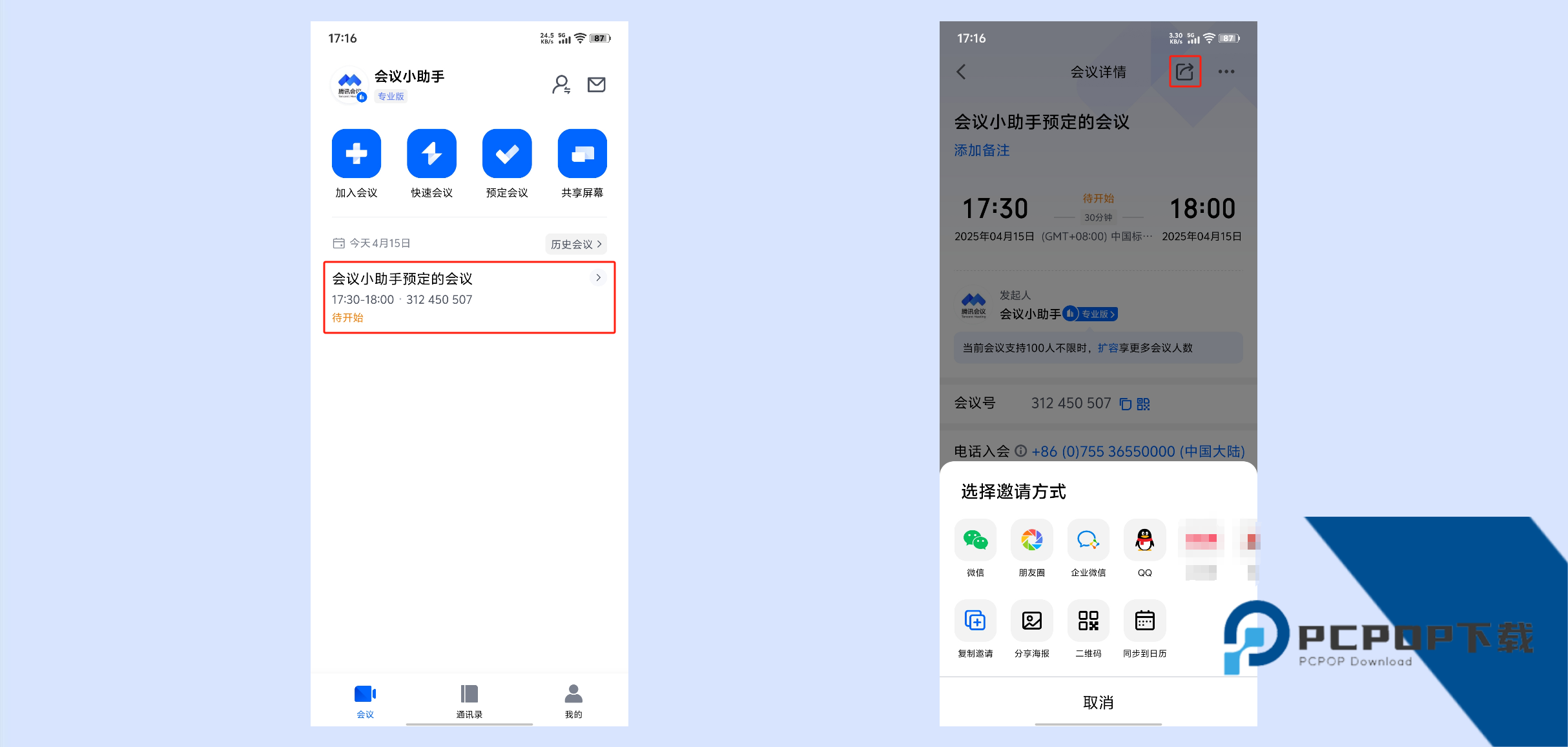 会议外点击会议列表中的会议,进入会议详情页,点击右上角的“分享”按钮,选择合适的邀请方式分享给与会成员即可。