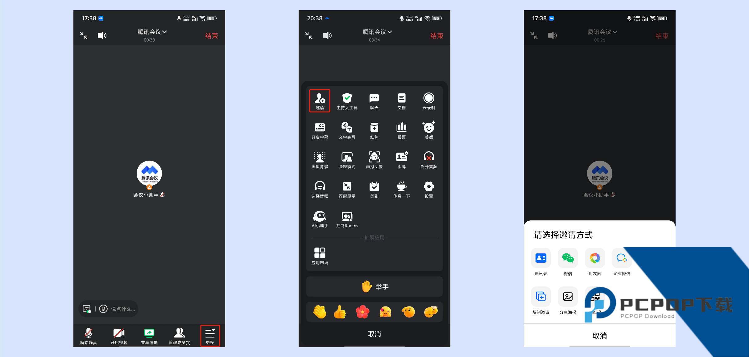 会中点击底部工具栏【更多】->【邀请】->点击选择邀请方式分享给参会成员即可。