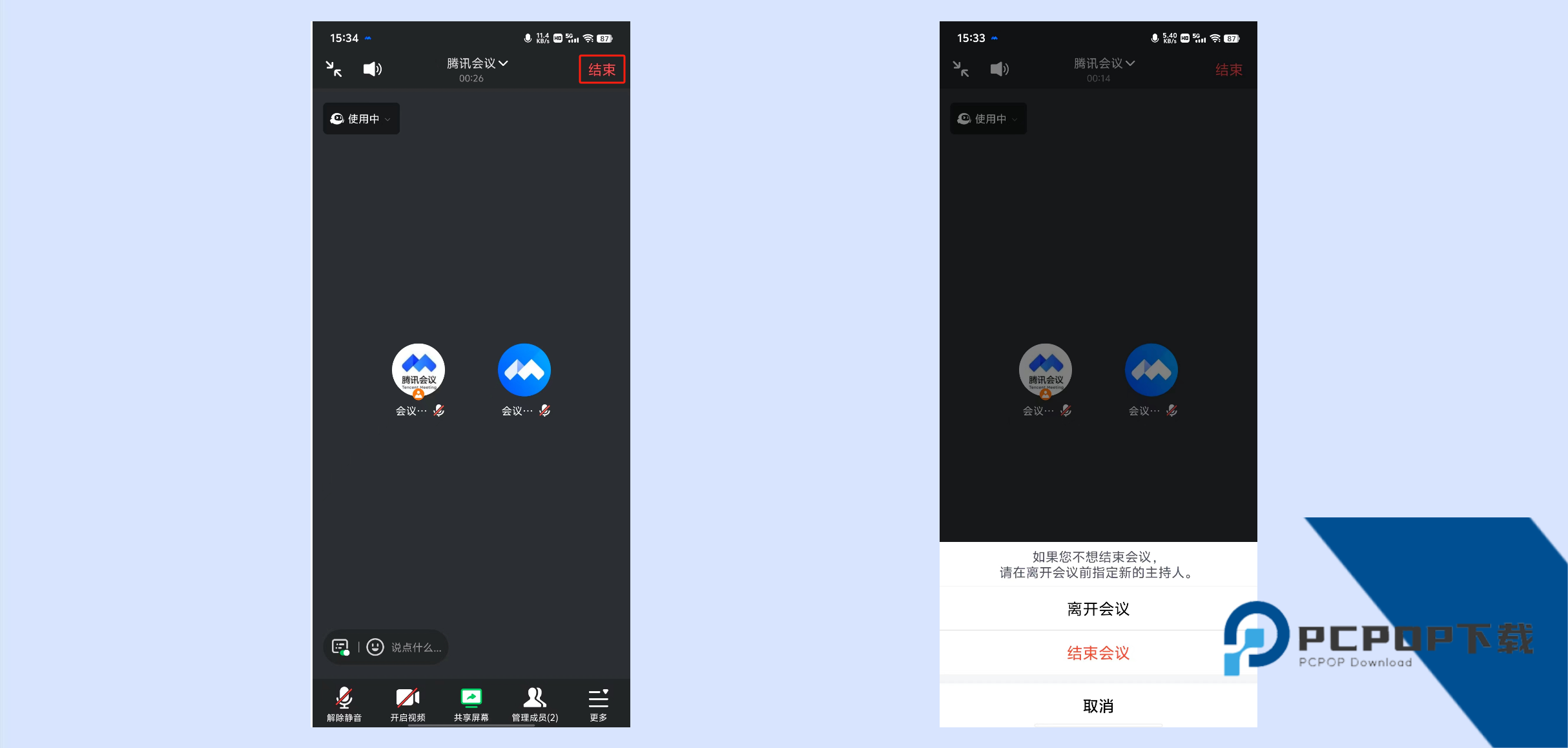 ①当您的身份为快速会议主持人时,您可以点击右上角【结束】选择【离开会议】或【结束会议】。