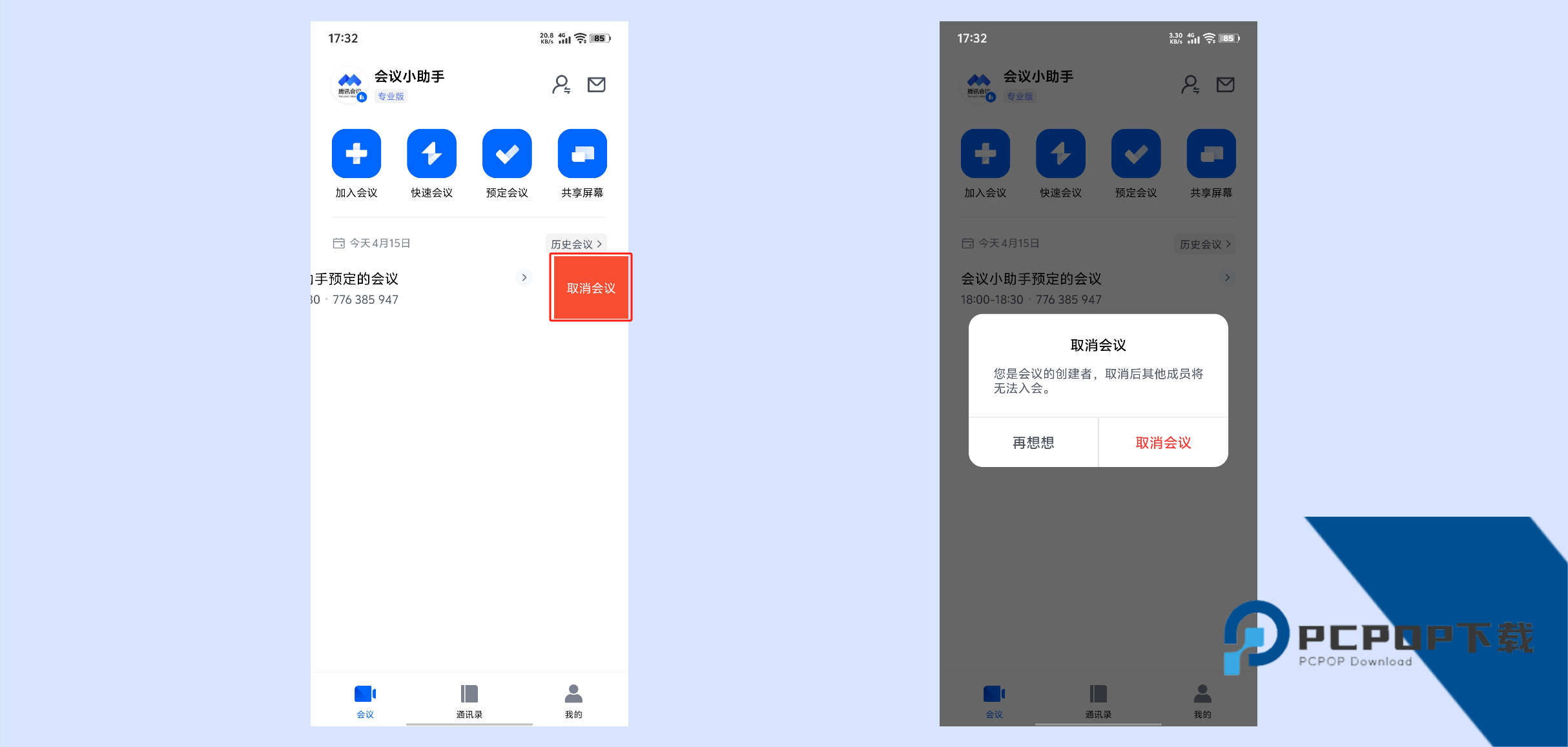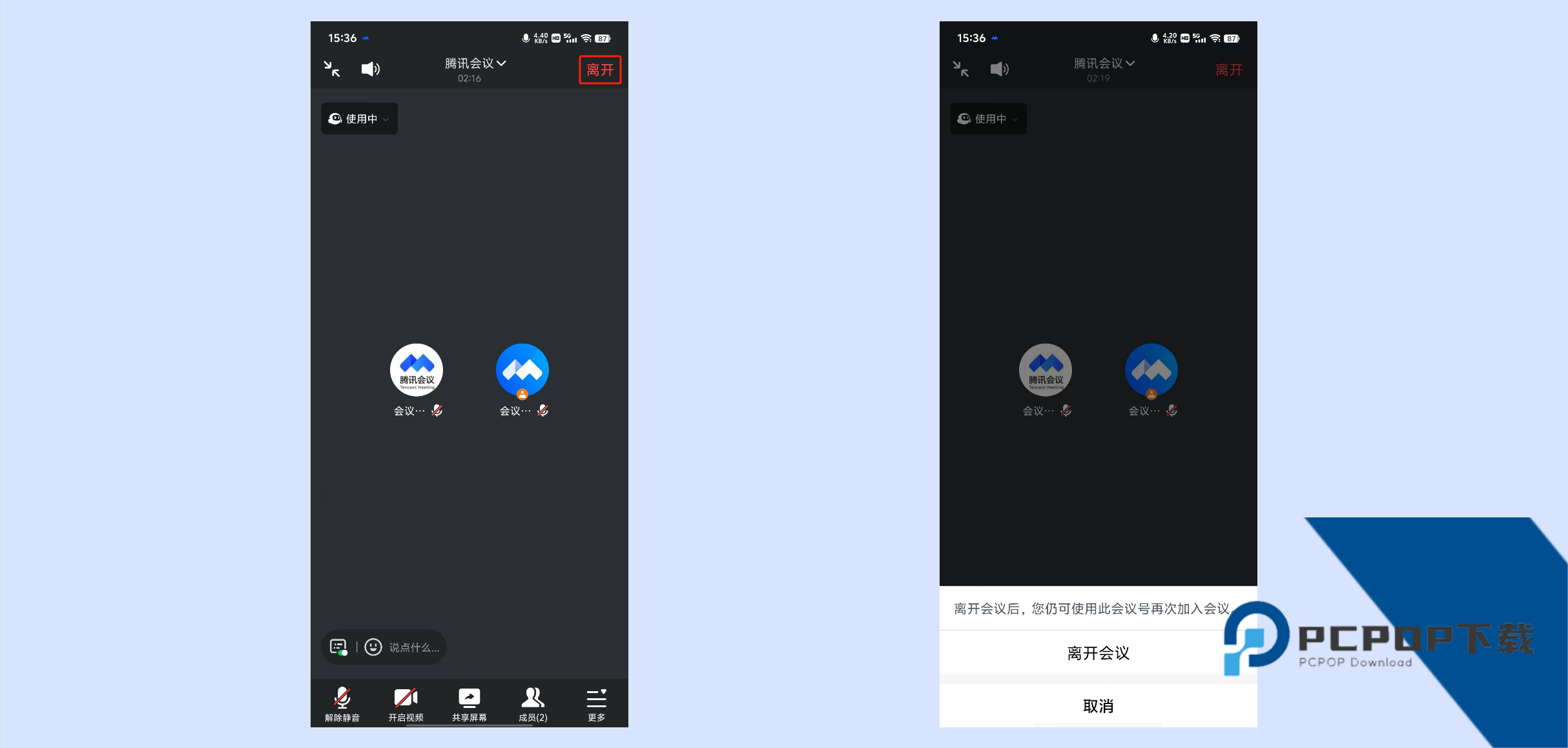 当您身份为成员时,该按钮为离开会议,您点击以后可以选择离开会议,在30天内(以主持人设置的预定开始时间计时)您都可以随时回到该会议(会议被删除则无法再进入)。