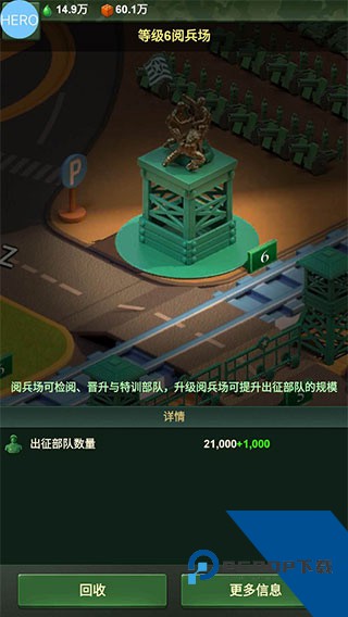 - 升级阅兵场可有效增加每次出征的部队总数,多100士兵可能就是胜利的关键。阅兵场另一重要功能是将低级兵种训练成当前可生产的高级兵种,是低消耗快速提升战力的必要途径。